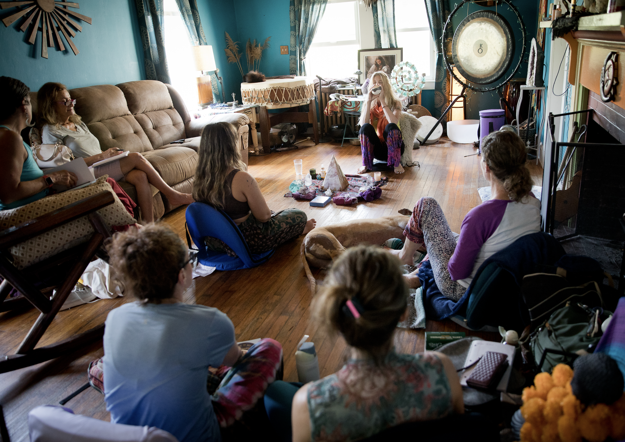 “Recently I experienced the Oracle Healing Mandala Drum for the first time and it was otherworldly. The space was thoughtfully prepared and the energy felt sweet and fierce. As the first group had their hands on the drum I felt pain in my physical body and sensed silk ribbons flowing through me. It was fascinating to feel the parts that were revealing themselves, intensifying then releasing. Retracing and unwinding. I saw time lines but they were not linear, more like spiraling ribbons that could flow easily in all directions. It was incredible to see and feel the drum move in patterns around the space. The messages that came to Amy for me were sweet and shifted my thinking regarding the loss of my mom. They taught me new ways to embody grief, and revealed how maternal love is everlasting. After the session I felt very peaceful. My dreams were strongly connected to the spirit world for many days afterwards. Something I have experienced only after returning home from a week long spiritual journey in the jungle. AHO!”